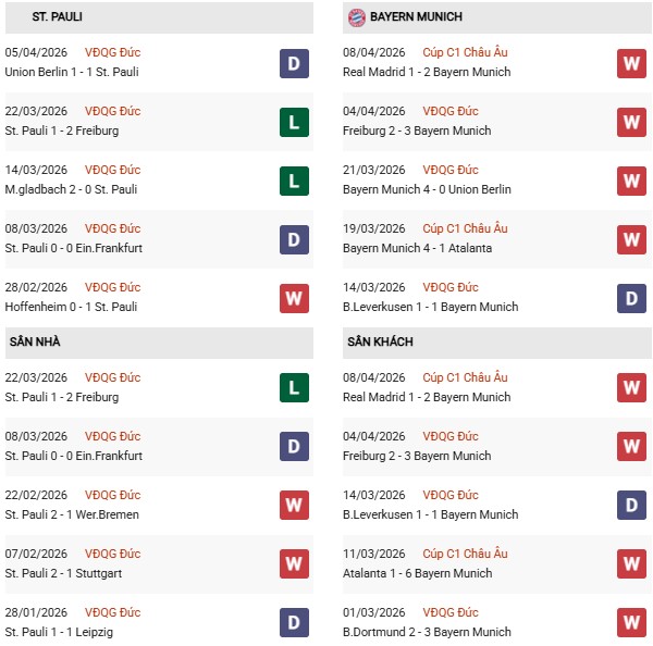 Thống kê phong độ St.Pauli vs Bayern Munich: