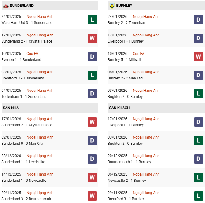 Thống kê phong độ Sunderland vs Burnley: