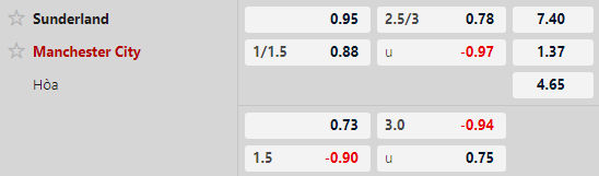 Thông tin tỷ lệ kèo Sunderland vs Man City: