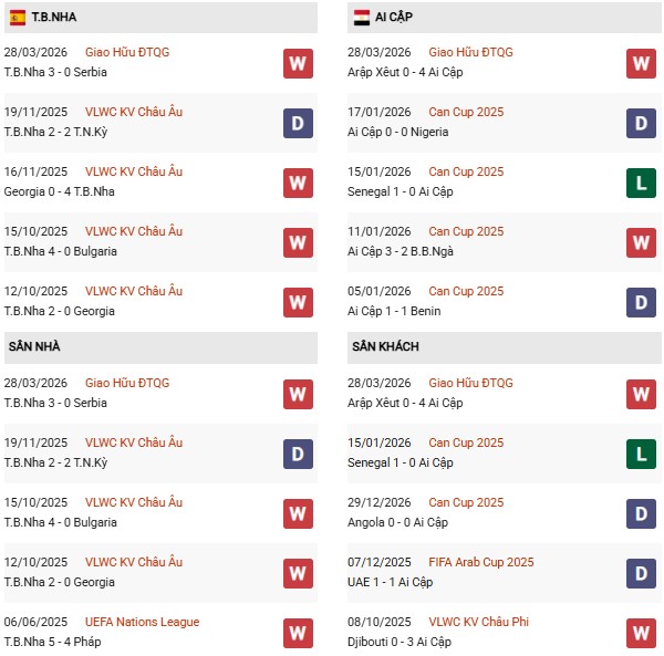 Thống kê phong độ Tây Ban Nha vs Ai Cập: