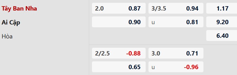 Thông tin tỷ lệ kèo bóng đá Tây Ban Nha vs Ai Cập: