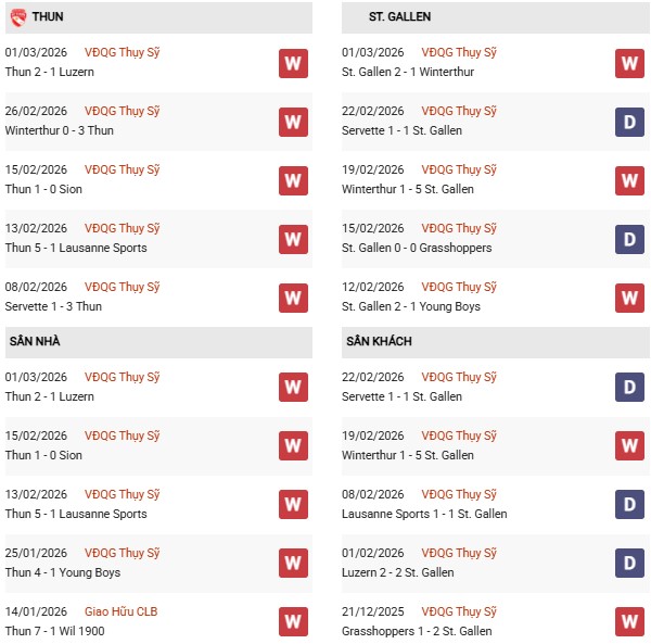 Thống kê phong độ Thun vs St.Gallen: