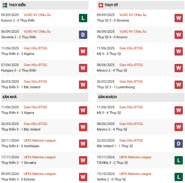 Thống kê phong độ Thụy Điển vs Thụy Sĩ: