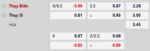 Thông tin tỷ lệ bóng đá Thụy Điển vs Thụy Sĩ: