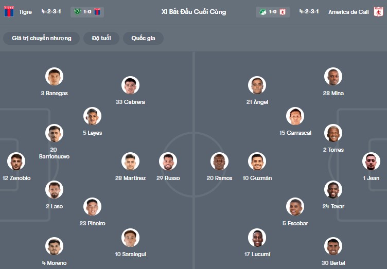 Đội hình dự kiến Tigre vs America de Cali: