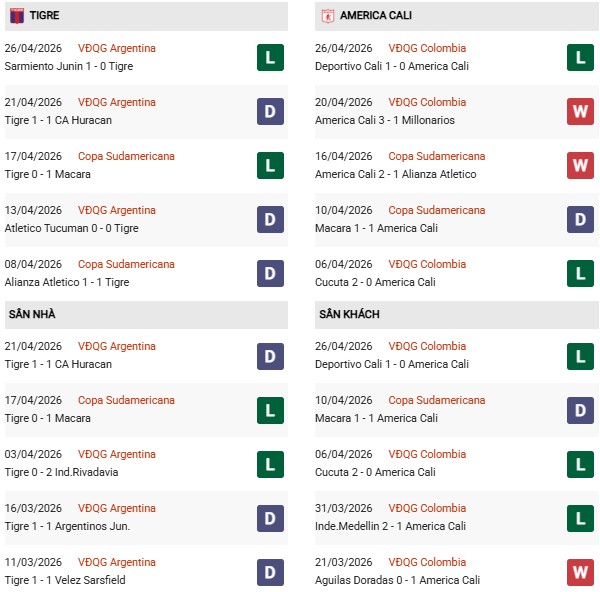 Thống kê phong độ Tigre vs America de Cali: