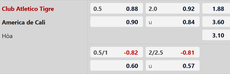 Mốc tài xỉu 2 bàn là rất thấp, phản ánh đúng thực tế về lối chơi thực dụng của cả hai đội. Cả 5 trận gần nhất của Tigre kết thúc với không quá 2 bàn thắng được ghi. Phía bên kia, 3/5 chuyến hành quân xa nhà gần đây của America de Cali cũng có kịch bản tương tự. Với việc Tigre buộc phải thận trọng để tìm kiếm điểm số đầu tiên và đội khách muốn bảo vệ ngôi đầu bảng, thế trận nhiều khả năng sẽ diễn ra chặt chẽ và khan hiếm bàn thắng.