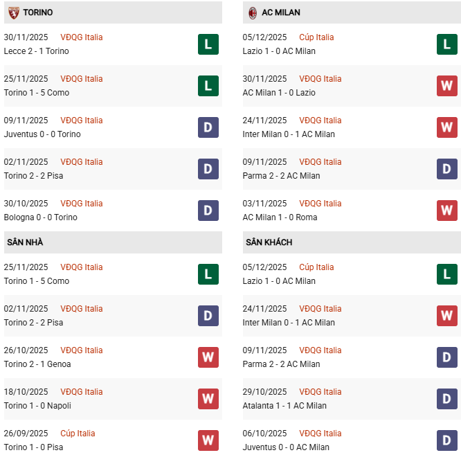 - Torino thắng 3, hòa 3, thua 4 trong 10 trận gặp Milan gần đây.