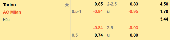 Thông tin tỷ lệ kèo bóng đá Torino vs Milan: