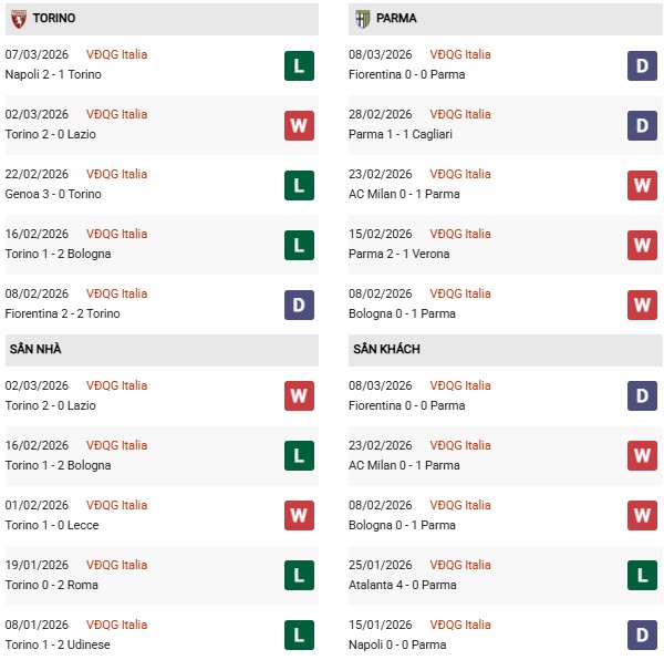 - Torino thắng 3, hòa 4, thua 3 trong 10 trận gặp Parma gần đây.
