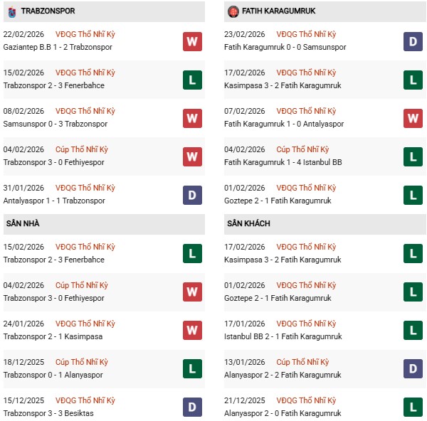 - Trên sân nhà, Trabzonspor thắng 4, hòa 1 trước Karagumruk.