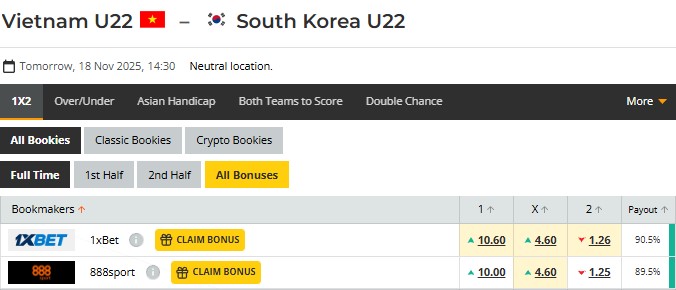 Thông tin tỷ lệ U22 Việt Nam vs U22 Hàn Quốc: