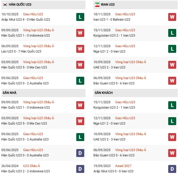 Thống kê phong độ U23 Hàn Quốc vs U23 Iran: