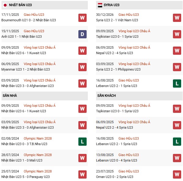 Thống kê phong độ U23 Nhật Bản vs U23 Syria: