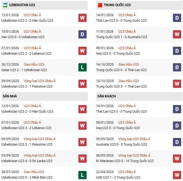 Thống kê phong độ U23 Uzbekistan vs U23 Trung Quốc: