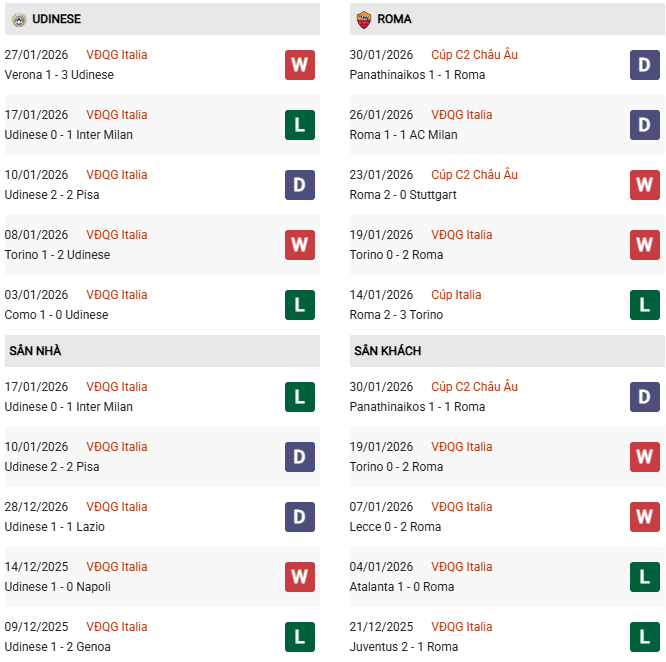- Trên sân nhà, Udinese thắng 2, thua 7 trước Roma.