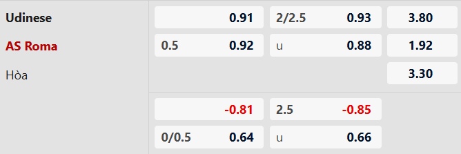 Thông tin tỷ lệ kèo bóng đá Udinese vs Roma:
