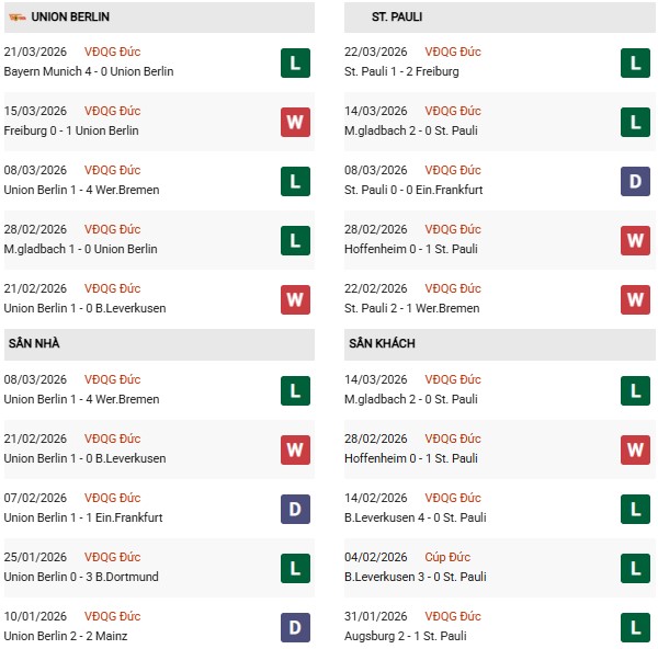 Thống kê phong độ Union Berlin vs St.Pauli: