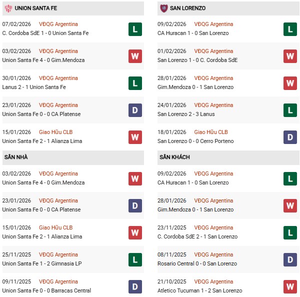 Ngoài ra trong quá khứ, Union Santa Fe chưa bao giờ cảm thấy dễ chịu khi chạm trán San Lorenzo trên sân cỏ. Đơn cử 8 lần vừa qua nghênh đón đối thủ này, đại diện của tỉnh Santa Fe chỉ thắng 3. Không như Union Santa Fe, San Lorenzo đều được đua vô địch ở cả 2 chặng của mùa 2025.