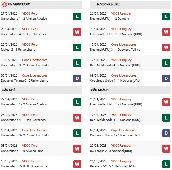 Thống kê phong độ Universitario vs Nacional: