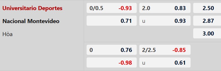 Việc để Universitario nằm cửa trên với mức chấp 1/4 bàn chủ yếu dựa vào lợi thế sân bãi tại Lima. Tuy nhiên, đây là tỷ lệ đầy rủi ro cho những ai tin tưởng đội chủ nhà. Universitario đang có hiệu suất ghi bàn rất kém tại đấu trường châu lục và thường xuyên thua kèo châu Á trong thời gian qua (thua kèo 3/5 trận gần nhất). Trong khi đó, Nacional đang là lựa chọn an toàn với 3/5 trận thắng kèo vừa qua. Với mục tiêu duy trì ngôi đầu bảng, Nacional hoàn toàn đủ khả năng ra về với ít nhất 1 điểm.