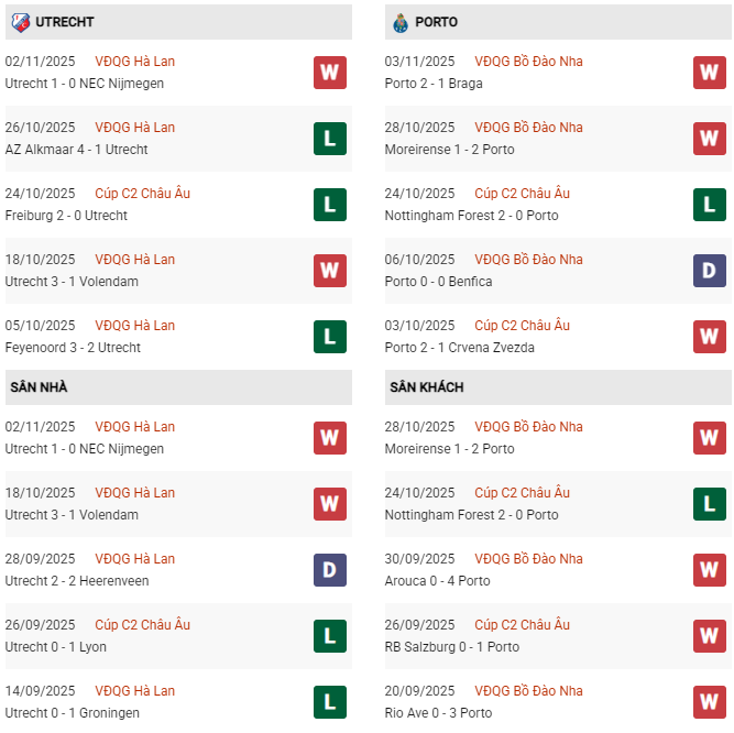 Phong độ của Utrecht vs Porto có nhiều sự chênh lệch vào lúc này. Trong khi Utrecht thua 3/5 trận gần nhất thì Porto thắng 3/5 trận vừa xong.