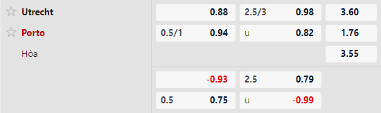 Thông tin tỷ lệ kèo Utrecht vs Porto: