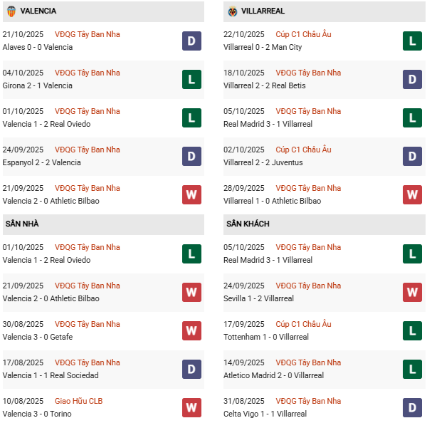 Trong những lần đối đầu gần đây, Valencia cũng không có thành tích khả quan trước Villarreal. Mùa trước, hai đội hòa nhau 1-1 ở cả hai lượt trận La Liga, còn chiến thắng gần nhất của Valencia trước “Tàu ngầm vàng” đã diễn ra từ tháng 1/2024 (3-1 trên sân Mestalla).