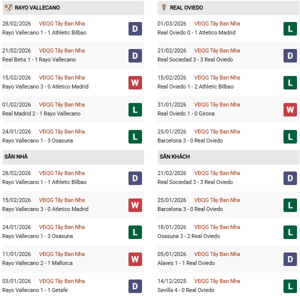 Phong độ sân khách của họ lại càng tệ. Ở mùa giải 2025/26, Oviedo mới duy nhất 1 lần giành chiến thắng trong các cuộc hành quân, đó là trận thắng 1-2 trên sân của Valencia hồi đầu tháng 10 năm ngoái, còn lại họ hòa 4 và phải nhận tới 8 thất bại. Với thành tích sân khách kém cỏi ấy, Oviedo khó có thể tự tin khi đến làm khách ở Vallecas.