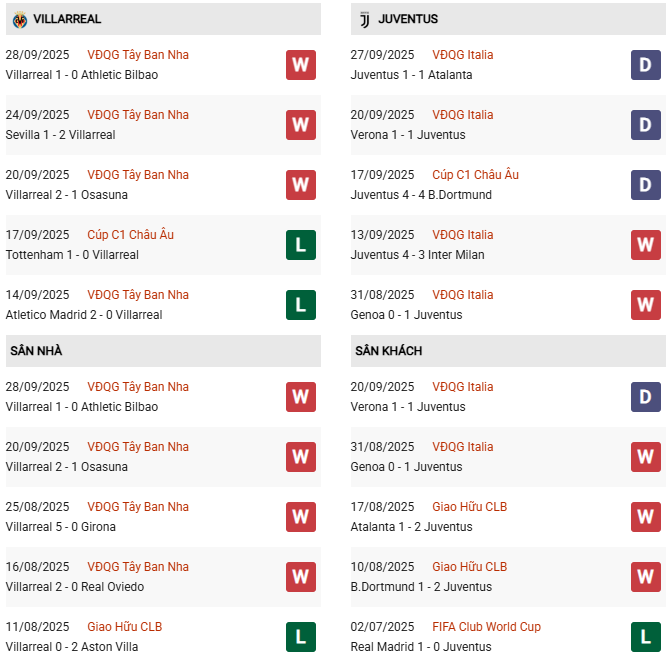Thống kê phong độ Villarreal vs Juventus: