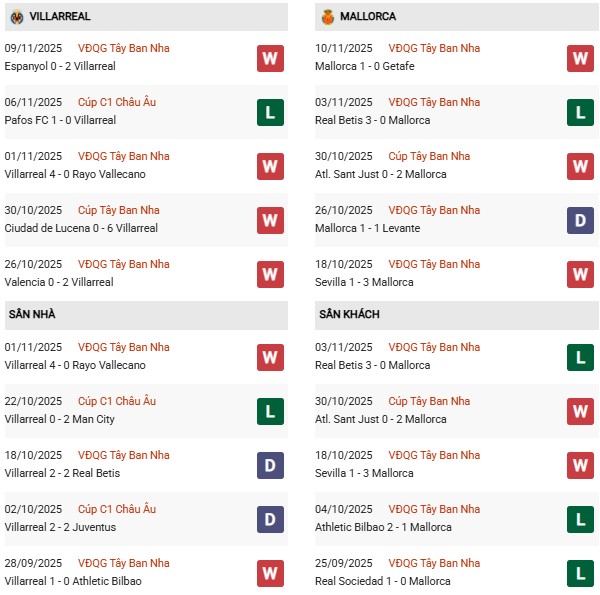 Thống kê phong độ Villarreal vs Mallorca: