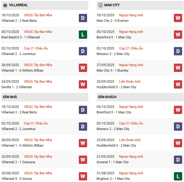 - Villarreal thua cả 2 trận gặp Man City gần đây.