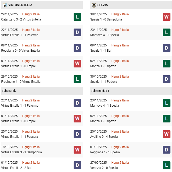 Thống kê phong độ Virtus Entella vs Spezia: