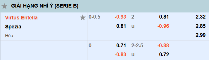 Thông tin tỷ lệ cược Virtus Entella vs Spezia: