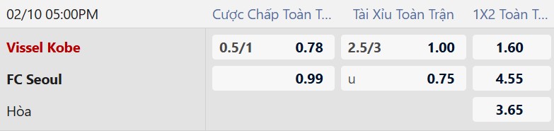 Mức tài xỉu trận đấu được niêm yết ở mốc 2 3/4 bàn. Các thống kê đang ủng hộ kịch bản nhiều bàn thắng. Cụ thể, 3/5 trận gần nhất của Vissel Kobe tại Cúp C1 châu Á có từ 3 bàn thắng trở lên. Bên phía FC Seoul, xu hướng Tài cũng khá rõ ràng khi 6/10 trận gần đây của đội bóng này kết thúc với kịch bản tưng bừng bàn thắng. Ngoài ra, trận đối đầu duy nhất giữa hai đội trong quá khứ cũng nổ Tài, khi có tới 6 bàn thắng được ghi.