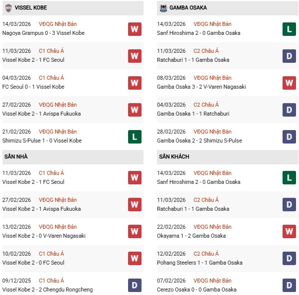 Thống kê phong độ Vissel Kobe vs Gamba Osaka: