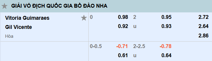 Thông tin tỷ lệ Vitoria Guimaraes vs Gil Vicente: