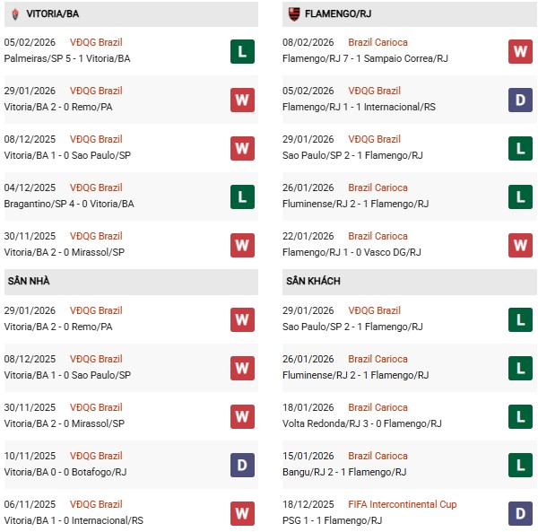 Xét về phong độ, Vitoria có 4 chiến thắng, 4 trận hòa và 2 thất bại trong 10 trận gần nhất trên mọi đấu trường. Đáng chú ý, sân nhà đang là điểm tựa lớn khi Vitoria sở hữu thành tích 6 chiến thắng, 2 trận hòa và chỉ 2 thất bại trong 10 trận gần đây. Tuy nhiên, trước một đối thủ có chất lượng đội hình vượt trội như Flamengo, thử thách dành cho đội chủ sân Barradão là không hề nhỏ.