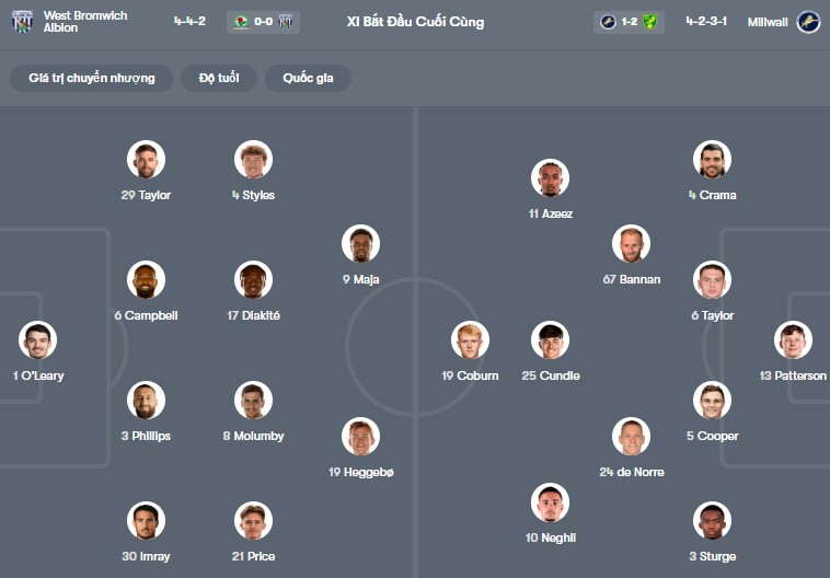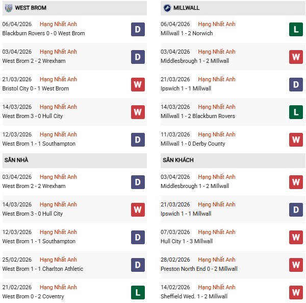 Trên sân nhà, West Brom cũng hòa 4, thua 3, chỉ thắng 1 ở 8 trận gần đây. Vì thế, đây là cơ hội để Millwall cải thiện điểm số và nuôi hy vọng giành vị trí thứ nhì kèm suất thăng hạng Premier League mùa sau.
