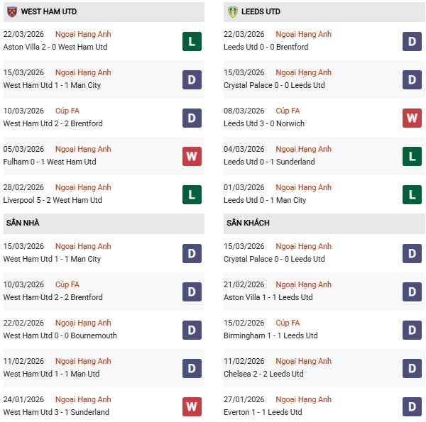 - West Ham thắng 5, hòa 3, thua 2 trong 10 trận gặp Leeds gần đây.