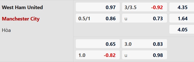 Thông tin tỷ lệ kèo bóng đá West Ham vs Man City: