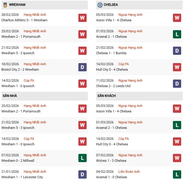 Thống kê phong độ Wrexham vs Chelsea: