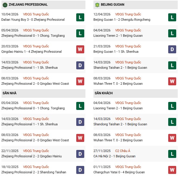 Thống kê phong độ Zhejiang vs Beijing Guoan: