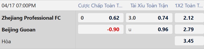 Thông tin tỷ lệ kèo Zhejiang vs Beijing Guoan: