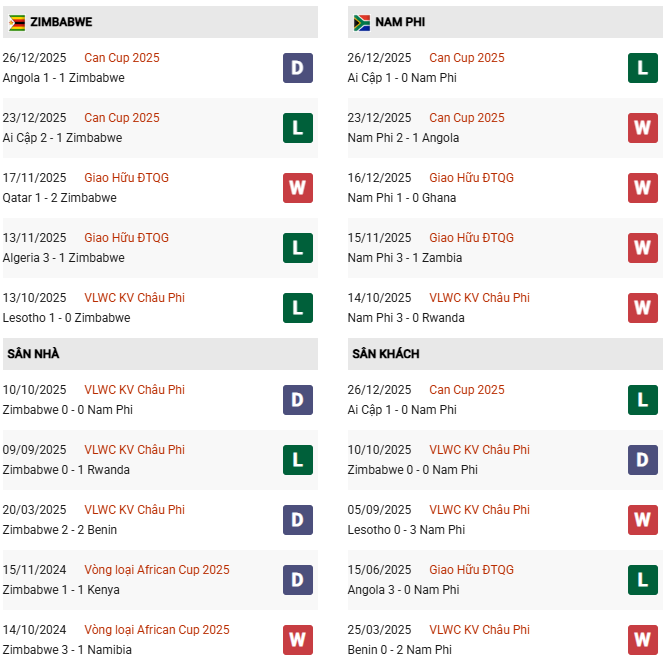 Thống kê phong độ Zimbabwe vs Nam Phi: